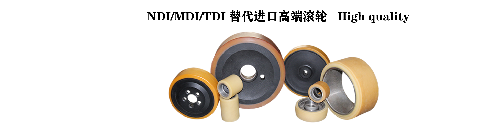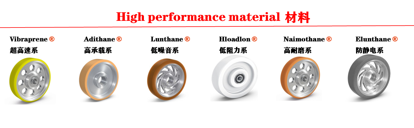 High-quality wheel materials for your applications 高性能材料六大材料系列我们可以根据客户实际工况,合成与工况匹配的高性能聚氨酯材料,我们掌握材料核心技术。Vibraprene® 97°Shore A 超高速系列Vibraprene®97°ShoreA是专业为超高速工况开发的高性能聚氨酯材料,我们结合了NDI的高承载优势和低游离PPDI的低内生热优势,再结合实际应用工况,开发出这款具有非常优异力学性能的材料,可以有效防止滚轮被压扁,同时还能保证具有一定的弹性,防止材料脆化断裂,滚动阻力也降低20%,目前使用过的最高时速达140km/H, 单轮最高承载达10吨,该款材料特殊适合在超高速情况下使用,如超级过山车滚轮,超速AVG 支撑轮。超高速度 典型应用:超级过山车承载轮长寿命低阻力低内生热Adithane® 95° Shore A 高承载系列Adithane®95°ShoreA是基于NDI型聚氨酯预聚体,由于NDI(1,5萘二异氰酸酯)属于稠环芳烃衍生物,其硬段的熔点达320°,而MDI和TDI与丁二醇的硬段熔点分别为230°和210°,所以Adithane在较宽的温度范围内其剪切模量不变,有非常好的承载性能和抗撕裂性能,优异的压缩永久变形和耐油性,可以替代目前流行的科思创公司的Vulkolan系列。•高承载 典型应用:单轨吊驱动轮•抗撕裂•高耐磨Naimothane® 96°Shore A 高耐磨系列Naimothane®96°Shore A是专业为耐磨工况设计开发的,相对于普通的聚氨酯材质它具有更好的耐磨性能,为了改善其耐磨性我们在生产过程中加入了一些微量元素,使其耐磨性能提高了30%,而且不容易掉渣,不产生粉末,用它生产出来的线轮可以替代钢轮•超耐磨 典型应用:线轮,轨道滚轮•抗蠕变•耐候Lunthane® 75°ShoreA 静音系列Lunthane®7